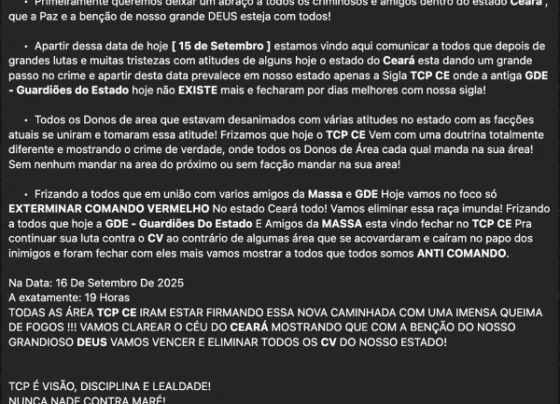 Um comunicado oficial divulgado por criminosos do Terceiro Comando Puro do Ceará (TCP-CE), na última segunda-feira (15/9), anuncia o início…