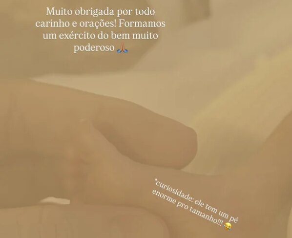 No fim da publicação, a influenciadora resolveu brincar com o tamanho do pezinho do bebê: “Curiosidade: ele tem um pé enorme pro tamanho!”, completou.