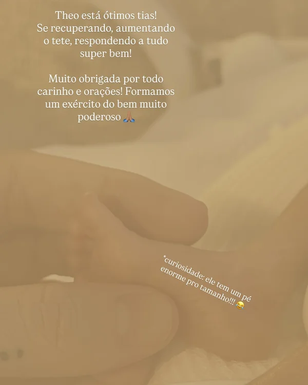 “Theo está ótimo, tias! Se recuperando, aumentando o tetê, respondendo a tudo superbem! Muito obrigada por todo carinho e orações! Formamos um exército do bem muito poderoso”, escreveu ela.