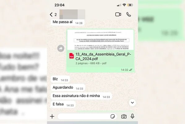 Em prints de conversas de um grupo no WhatsApp, o grupo contesta o uso de suas assinaturas e indica que teve suas rubricas forjadas.