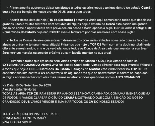 Um comunicado oficial divulgado por criminosos do Terceiro Comando Puro do Ceará (TCP-CE), na última segunda-feira (15/9), anuncia o início de um embate violento que pode transformar a guerra entre criminosos ainda mais sangrenta no estado nordestino.