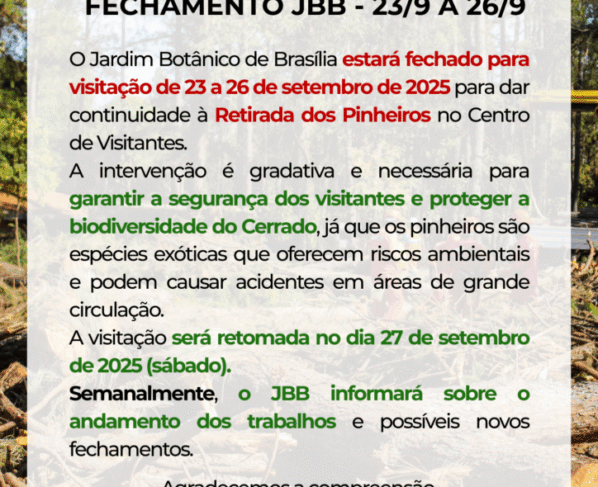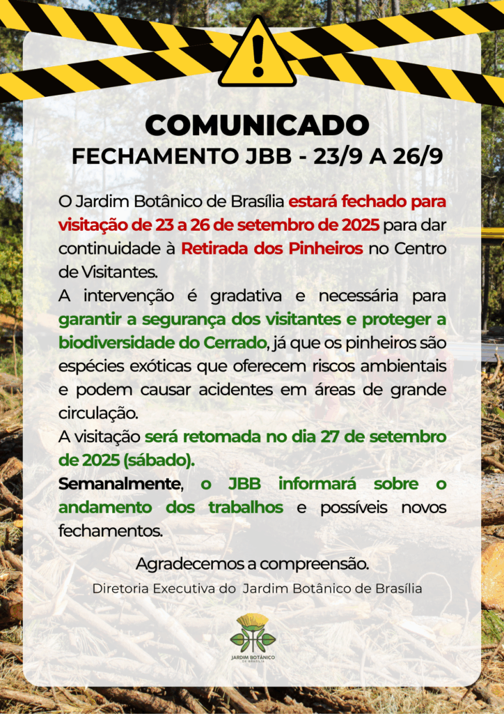 O Jardim Botânico de Brasília informa que permanecerá fechado para visitação entre os dias 23 e 26 de setembro de 2025, para dar continuidade à retirada dos pinheiros localizados no Centro de Visitantes.