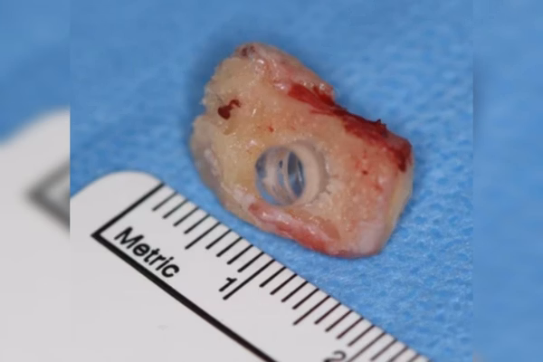 • O dente com a lente é colocado temporariamente sob a pele da bochecha do paciente. Ali, ele fica envolto por tecido conjuntivo, o que ajuda a criar uma camada de proteção biológica.