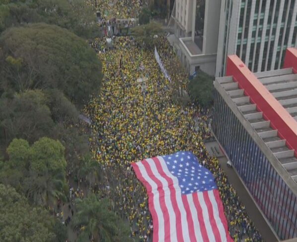 O correspondente do jornal francês Le Monde também relatou a presença de uma enorme bandeira norte-americana hasteada pela multidão, “como forma de implorar pela ajuda do presidente americano, Donald Trump, que impôs 50% de tarifas alfandegárias aos produtos brasileiros para defender seu protegido”, explica o texto.