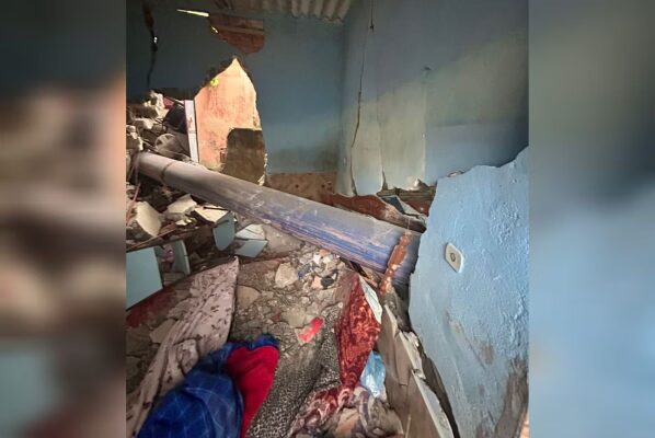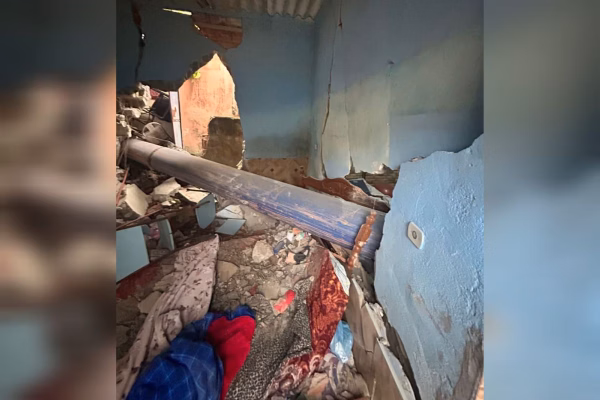 Ela estava dentro de casa, localizada na Rua Melchor Barbosa, quando foi atingida pela estrutura de grande porte. A parede da residência ficou destruída (veja imagens abaixo).