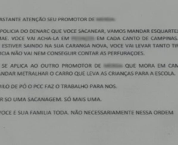 No texto, os criminosos o ameaçavam de “levar tanto tiro de AR-15, que a perícia não vai nem conseguir contar as perfurações”. O documento, assinado como “chumbo grosso com munições”, também citava outro promotor e fazia menção a familiares.