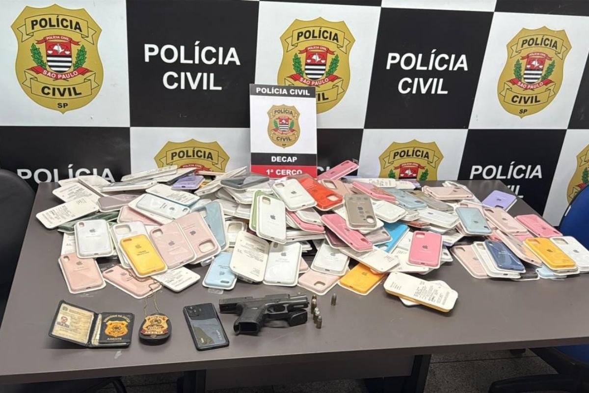 Além de prender agente aposentado, Polícia Civil apreendeu arma, celular, películas e capinhas de aparelhos telefônicos