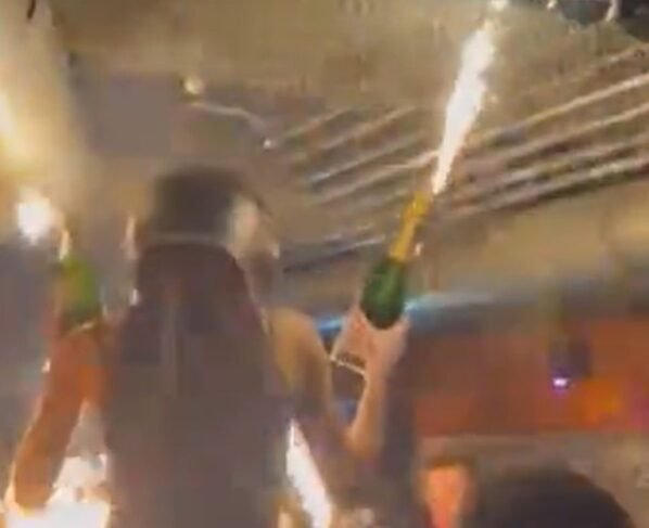 O vídeo mostra uma mulher de capacete sendo carregada nos ombros de outra pessoa. Ela segura garrafas de champanhe com velas pirotécnicas. Nas imagens é possível ver a chama da vela encostando na espuma acústica instalada no teto do bar, que pega fogo.