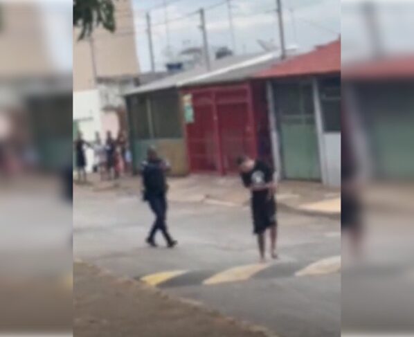 No momento em que o indivíduo armado com a faca se afasta, um dos policiais saca a arma de choque e dispara contra ele, fazendo com que o homem largue a arma branca e caia no chão.